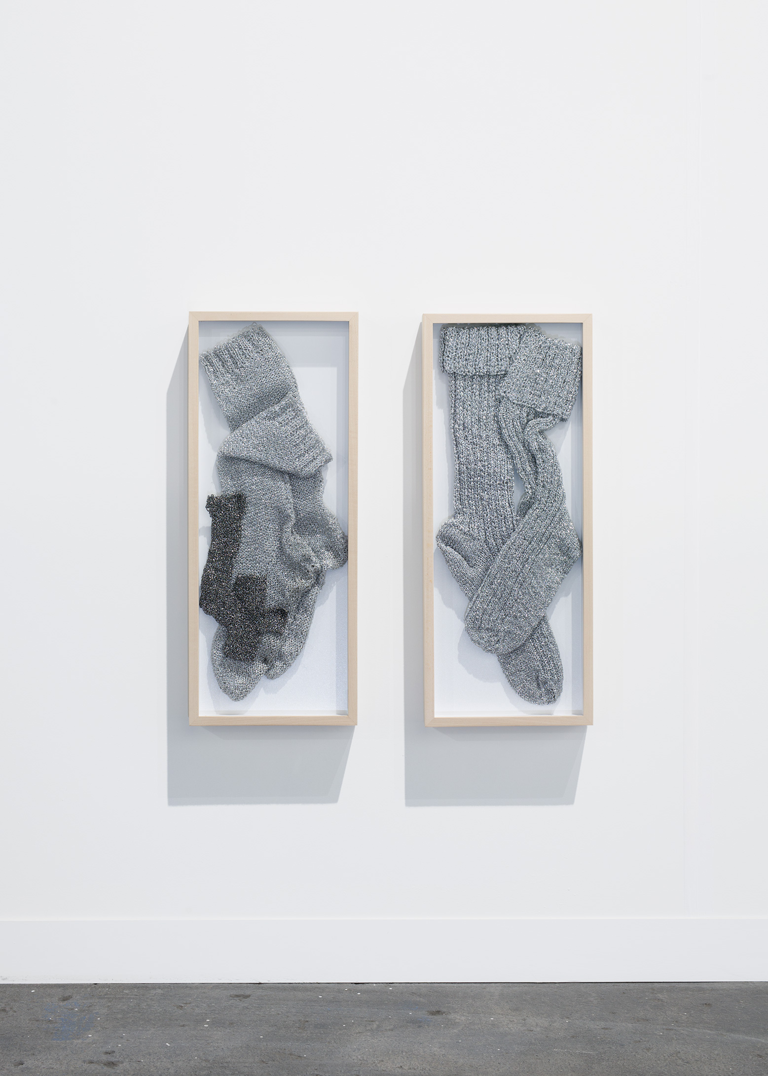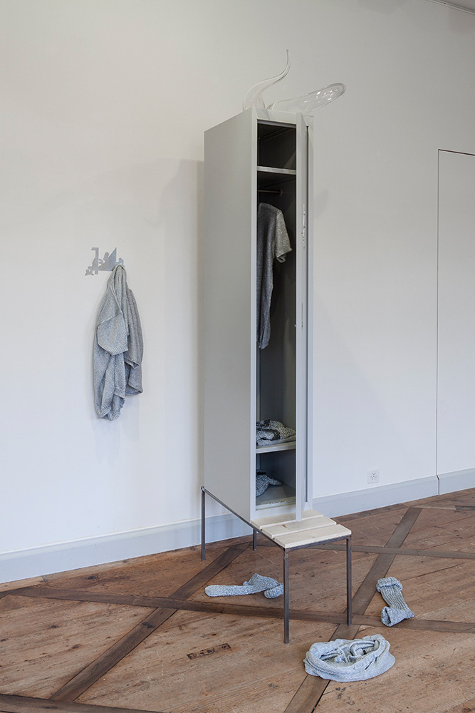 A locker room with sport garments in silverish wool,